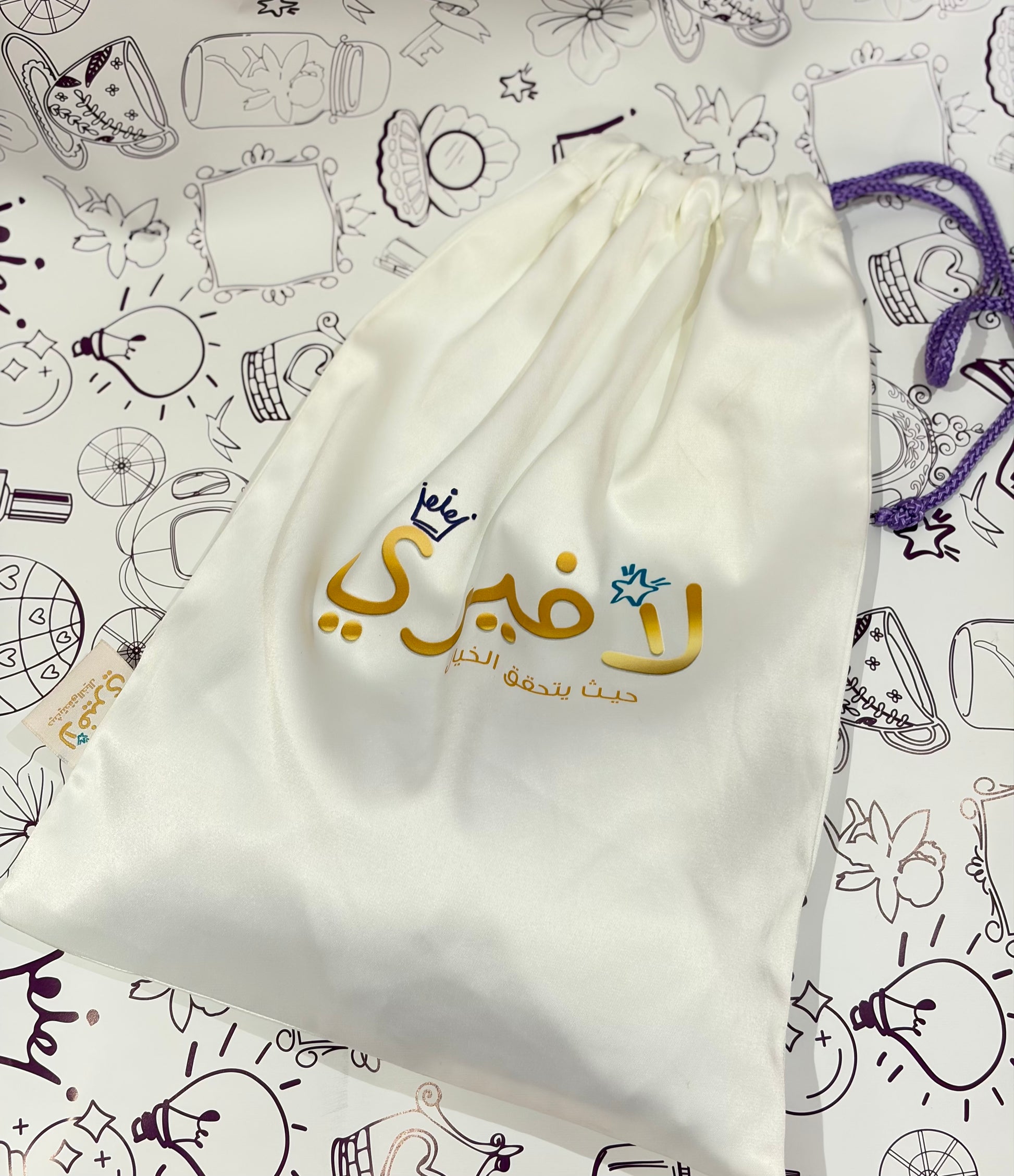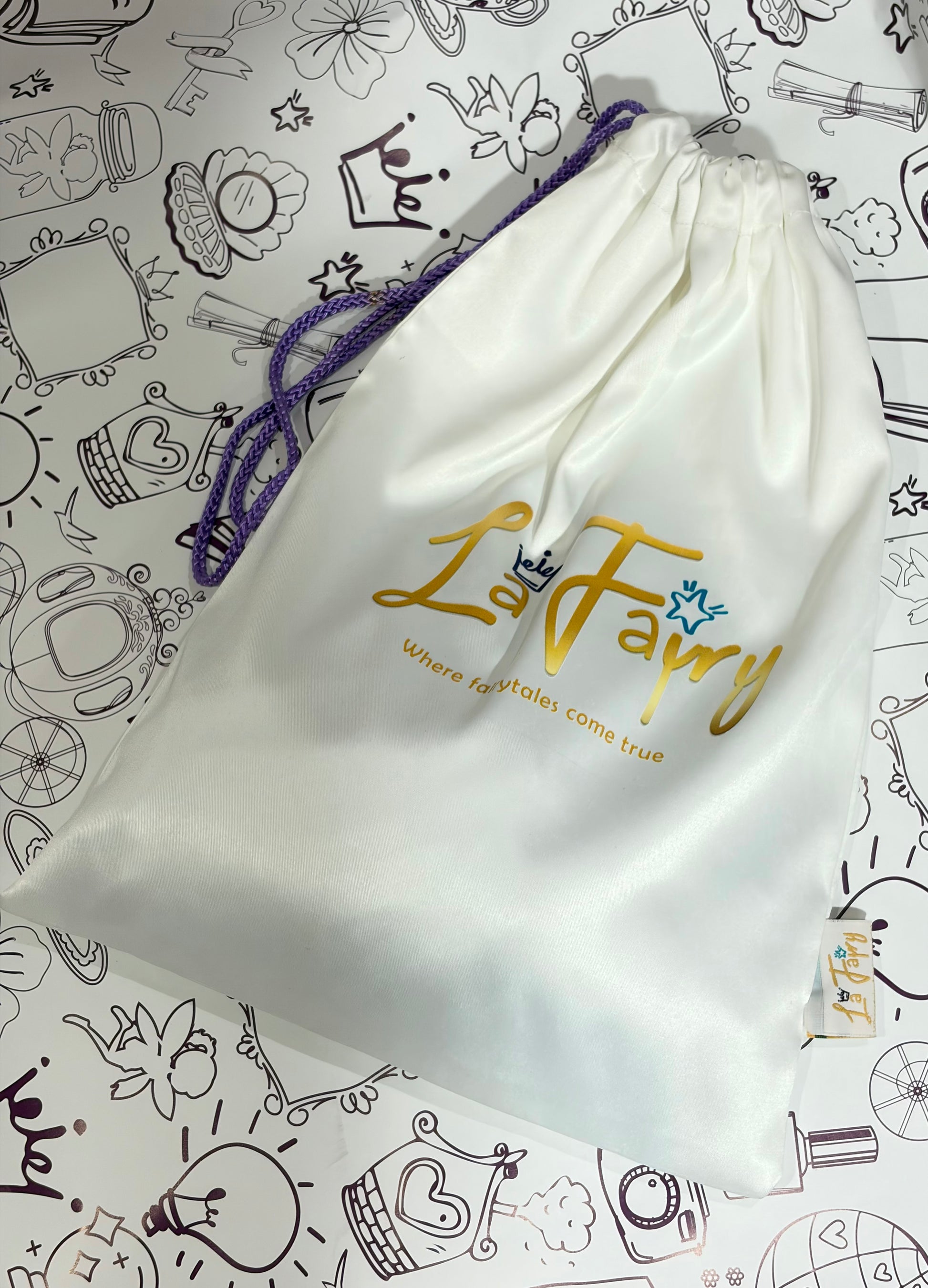 أنيق بتصميم فخم ولمسة ناعمة، مثالي لتغليف الهدايا والمجوهرات والإكسسوارات. مصنوع من قماش ساتان عالي الجودة بلون أبيض راقٍ، مع رباط شدّ باللون البنفسجي لإغلاق محكم وسهل الاستخدام. يتوسطه شعار La Fairy ليمنح المنتج طابعًا ساحرًا وفاخرًا.